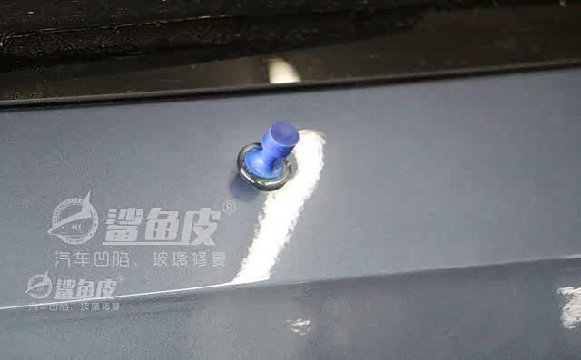 拉拔的原理很简单,就是利用热熔胶把一个和凹陷轮廓相同的吸盘粘在漆面上,然后再用拉锤用力拉出吸盘,这样这个凹陷就会被一起吸出来。在我们这十来年的修复经验当中,这种方式是最受到客户欢迎的。因为顶敲就意味着要从钢板的背面进行施工,那多数都是要进行拆装的。