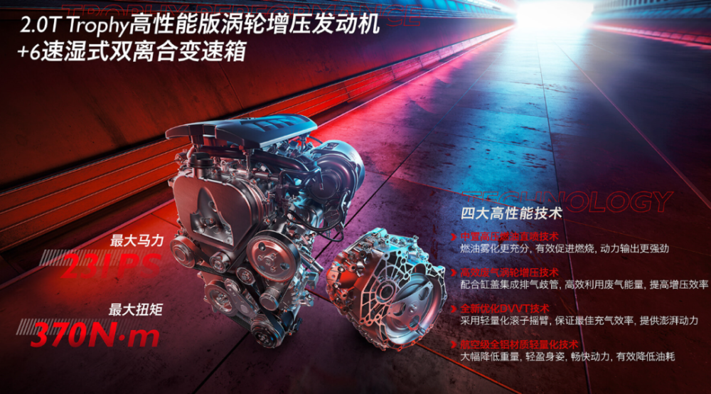 MG领航这次采用的是两套动力系统,2.0T车型使用Trophy高性能发动机+6速湿式双离合变速箱,最大马力231PS,最大扭矩370Nm,发动机具有中置高压燃油直喷技术、高效废气涡轮增压技术、全新优化DVVT技术、航空级全铝材质轻量化技术等四大特点;1.5T车型则使用了MEGA Tech高效发动机+MEGA Tech7速湿式双离合变速箱,最大马力173PS,最大扭矩275Nm。1.5T车型无论是发动机还是变速箱,均都有着更新、更先进的技术加持,相信新车上市后也会作为MG领航的主打车型来面向消费者。