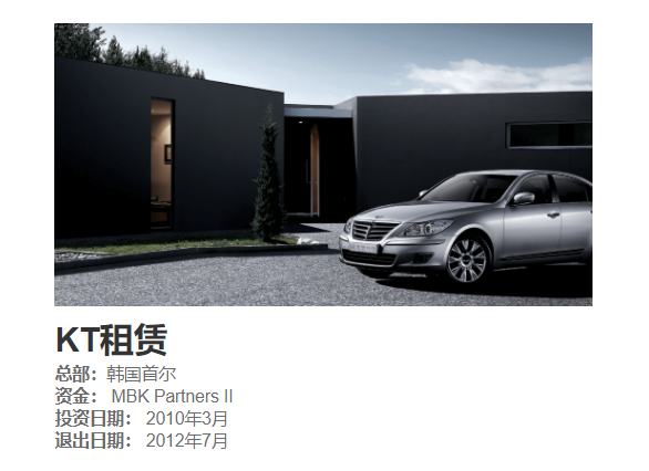 除了一嗨,MBK Partners曾入股的租车公司还有韩国KT公司。该公司的全称是KT Rental是韩国最大的汽车租赁公司,目前有61,200多辆汽车在运营。自2004年以来,该行业的复合年增长率超过20%,在该行业中,公司是领先的领导者,占有21%的市场份额。遍布全国的分支机构和销售办事处,涵盖韩国所有主要城市和旅游目的地。MBK Partners于2012年7月将其在该公司的股份出售给了KT。