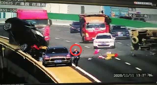 事故的原因,据说是因为一保时捷车主在应急车道上修车,用千斤顶代替三角警示牌放在车后方。谁知白色货车开来,就引起了失控,造成事故。