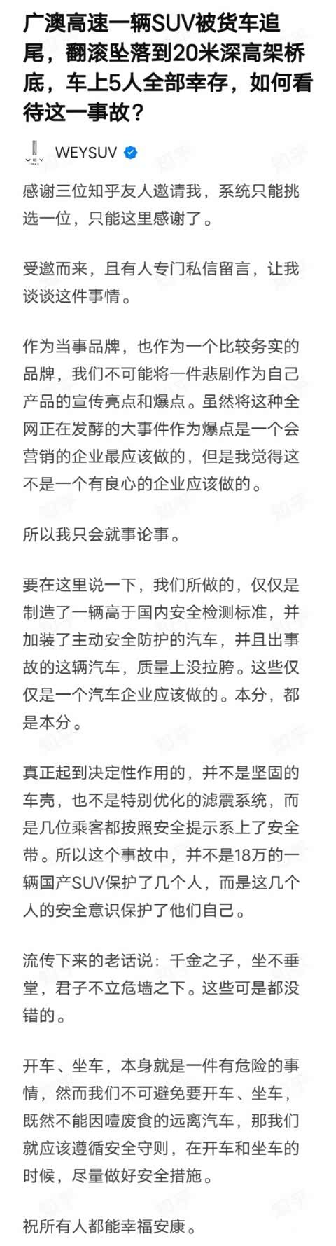 经过确认,这台SUV是长城的WEY。漫哥心想这下WEY可以借题发挥,对自己的安全性大吹特吹了。毕竟对一些公关来说,这可是千载难逢的机会,此时不吹更待何时?然而在某乎帖子上,长城官方竟然是这样回答的:
