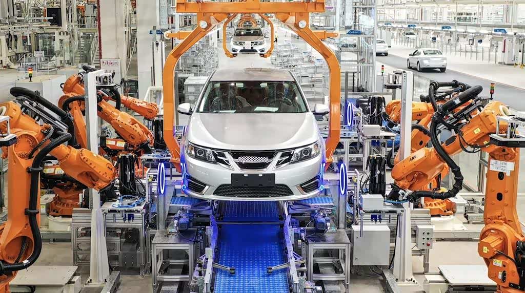 打开车门,许家印伴随地方领导一行走入车间,看到的基本是工业 4.0 概念宣传片的画面:德国西门子的传送带将白色车壳往前运输,特斯拉工厂同款的橙色库卡机械臂灵活地转动,对车身射出黄色的电焊弧。更远一些,身着白色工服的工人站在完工的汽车边上,拧着扳手。