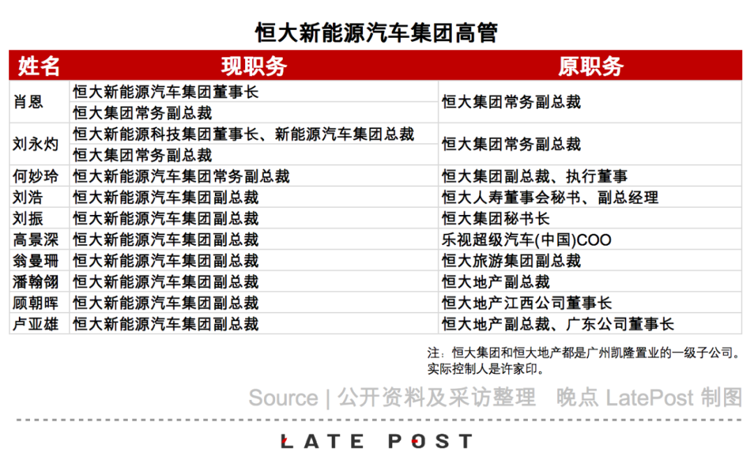恒大汽车管理团队同样来自恒大集团,基本全无汽车业背景。副总裁级别以上的 10 名高管,除了分管制造体系的副总裁高景深来自 FF,其余均来自恒大集团各业务线。董事长肖恩曾是恒大旅游集团董事长,总裁刘永灼正是当年主导恒大足球俱乐部改革的年轻总经理。