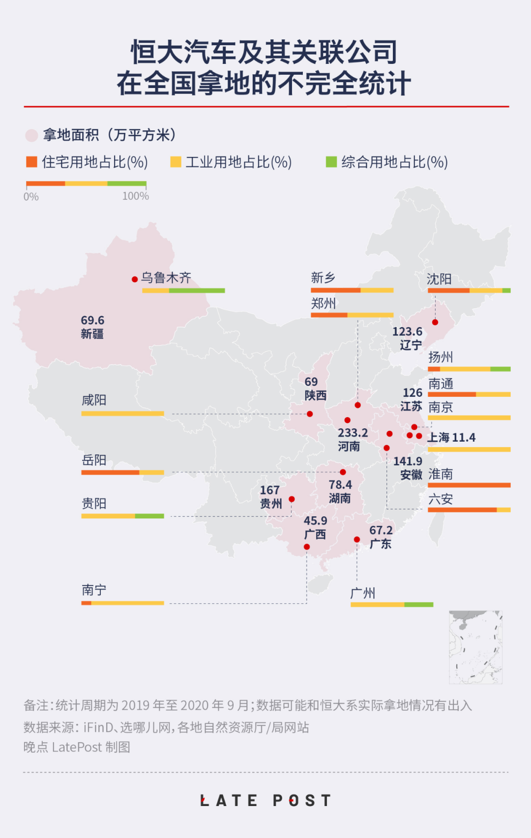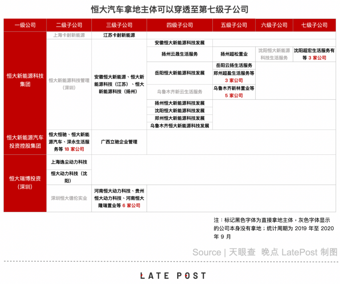 为了造车,恒大汽车在全国成立了多达七级子公司。根据《晚点 LatePost》不完全统计,恒大汽车仅在 2019 年 9 月至 2020 年 9 月间,就通过这些公司在各地拿了 1133 万平米土地。