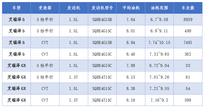 可以看到,两者的油耗也并没有本质的差距,只有少数细微的差别。值得一提的是,同样采用SQRE4G15C的艾瑞泽5手动挡的平均油耗为8.01L/100km,而同样动力艾瑞泽GX手动挡的平均油耗为7.88L/100km;同样采用SQRE4T15C的艾瑞泽5自动挡的平均油耗为8.48L/100km,而同样动力艾瑞泽GX自动挡的平均油耗为8.38L/100km。光从数据上看艾瑞泽GX似乎稍微要省油那么一丁点点。