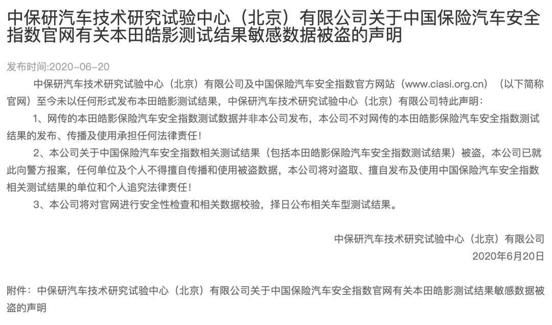 现在可以找到的痕迹是中保研在6月12日发布了皓影测试项目完成的公告,而结果却在官网上查询不到,紧接着的是6月20日官方给出的皓影数据被盗的公告,并且还表示相关的测试结果,结构和个人不得擅自使用,所以,这些相关的数据东西大家有兴趣可以自己去查阅下。