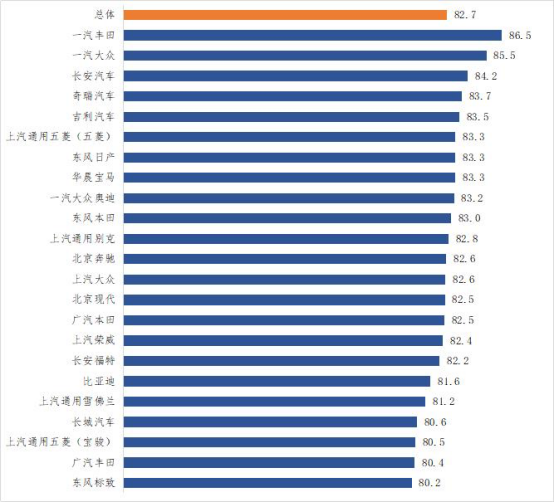 以平均分82.7分为分界线的话,此次共有12个品牌低于平均分,排在最末位的是,来自法系的东风标致,得分为80.2。