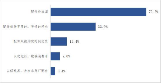 此外,超过两城消费者认为在4S店的实际消费比预想消费高,近四成消费者认为4S店的工时费标准高,七成消费者认为4S店服务中“配件价格高”。