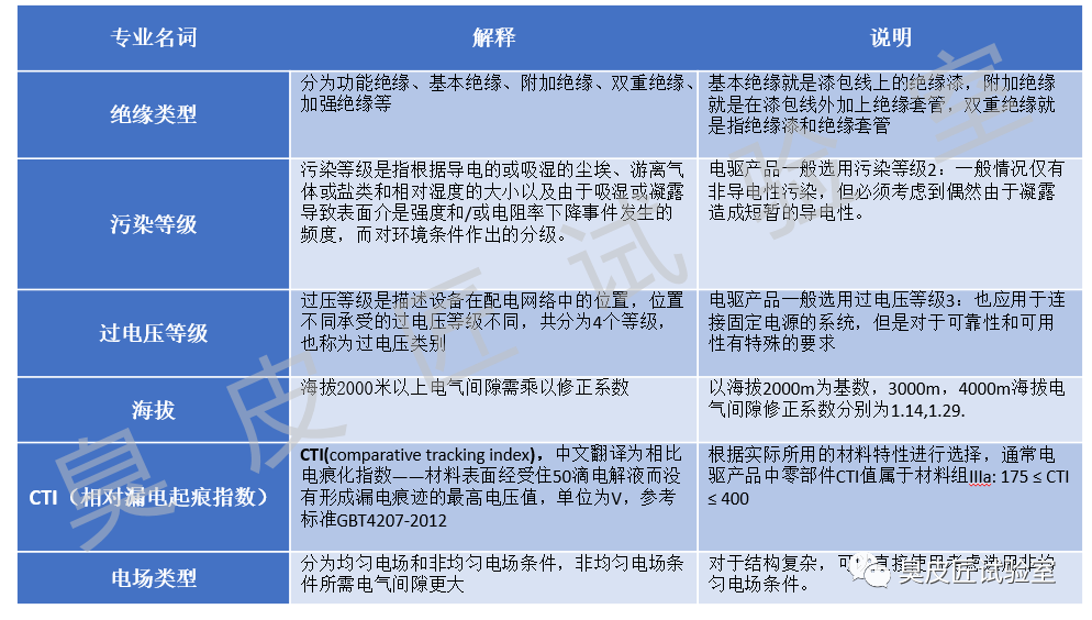 为了阐述清楚确定电气间隙、爬电距离的流程,需要对于一些主要的专业名词进行解释和说明,如下表供参考。