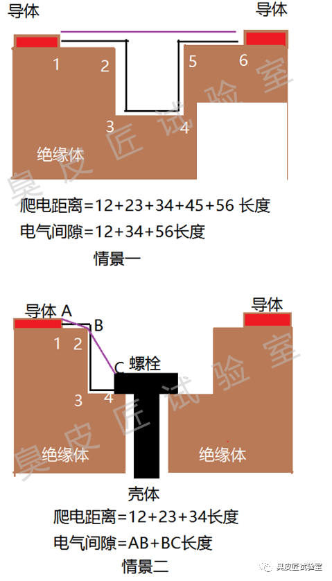 可以简单的理解,电气间隙是一个带翅膀的蚂蚁,飞的最短距离,而爬电距离是一个蚂蚁爬的最短的距离。电气间隙和爬电距离在具体计算时,涉及很多场景,具体情况要具体分析。下面两种场景,爬电距离和电气计算的方法。