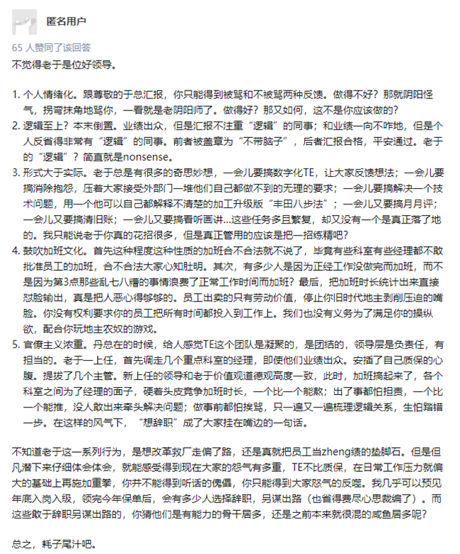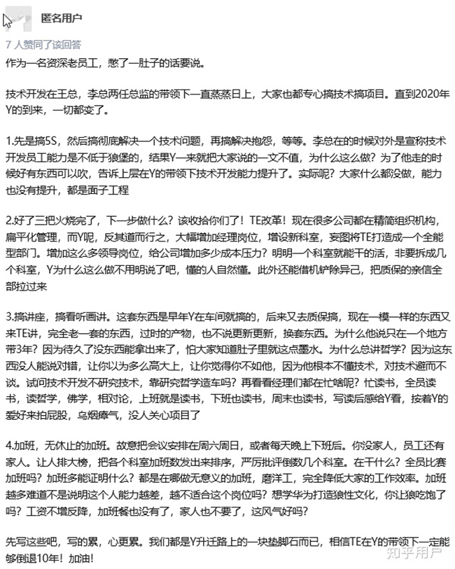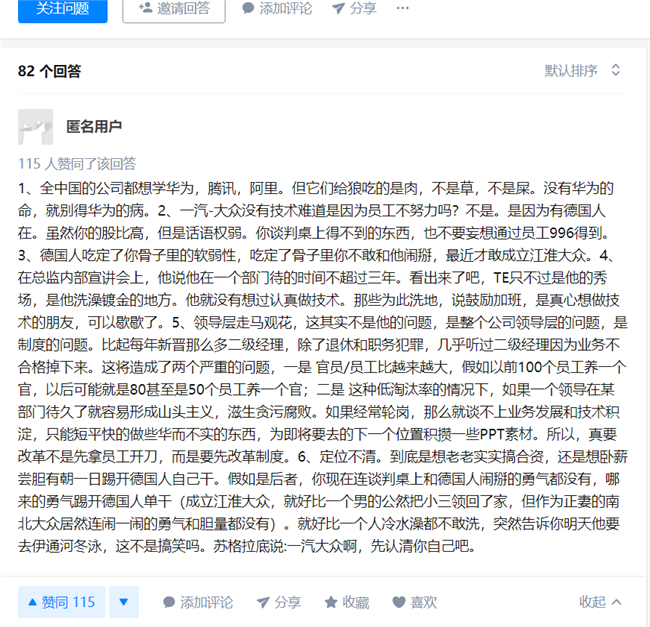 而更多的抱怨则来自知乎上一条“如何看待一汽大众技术开发部新任总监“鼓励”各个科室周六加班?”的问题贴。从官多兵少,到直接向新领导开炮“个人情绪化”,不一而足的抱怨一个接一个。