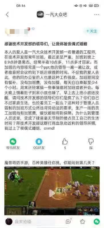 在一汽-大众贴吧里,《汽车专业网》编辑看到了一条名为“感谢技术开发部的领导们,让我体验丧偶式婚姻”的帖子。发帖人提到,其伴侣是一汽-大众技术开发部的一名普通工程师,在技术开发部假班到深夜是常有的事。而且加班期间没有加班费、餐补。在这样的“强制加班”下,其伴侣的家庭生活受到了严重的干扰。发帖人说:“拜技术开发部这群打鸡血急功近利的领导所赐,我过上了丧偶式婚姻”。