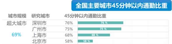 报告里还提到,45分钟通勤保障已成为国际共识,这部分通勤人口比重应达到90%。然而,统计数据显示,全国36个主要城市平均下来,能在45分钟内走完上班路的,只有76%。