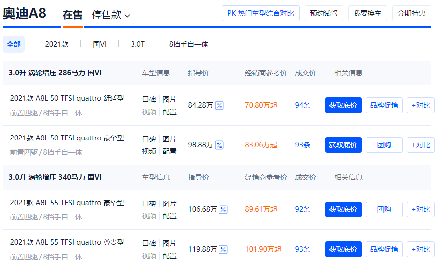 奥迪A8L,世界顶级豪华车中的重要成员,但是现在却有着如此大幅度的优惠。以北京地区为例,目前在经销商处 奥迪A8L(参数|询价)车系普遍有着将近20万的优惠,这样算下来,即使是最顶配的A8L价格也就是100万出头。