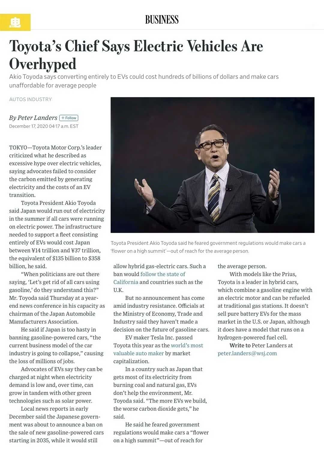 在日本这样一个主要依靠燃煤和天然气发电的国家,丰田章男认为电动汽车对环境并没多大帮助。他说,“我们生产的电动汽车越多,二氧化碳排放就越严重。”丰田章男担心政府的强制禁燃油车规定会让汽车成为普通人无法企及的山顶上的一朵花。