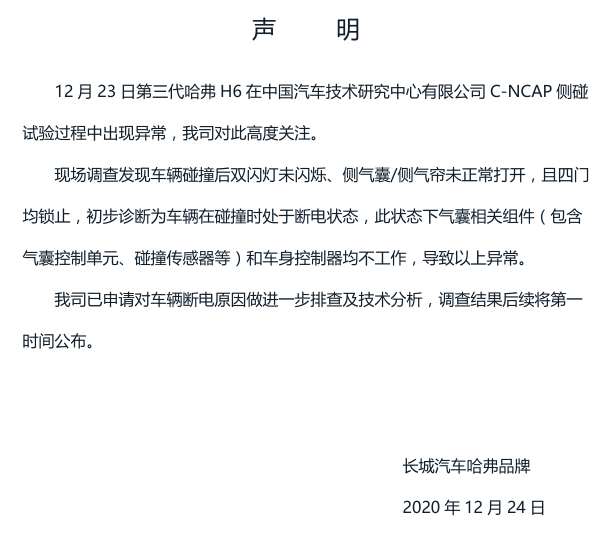 短评|大乌龙?中汽研侧碰哈弗H6气囊未弹出 厂家回应车辆没通电
