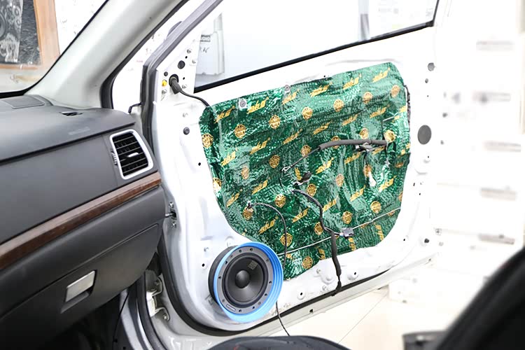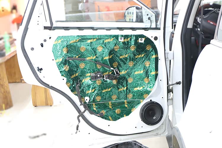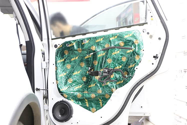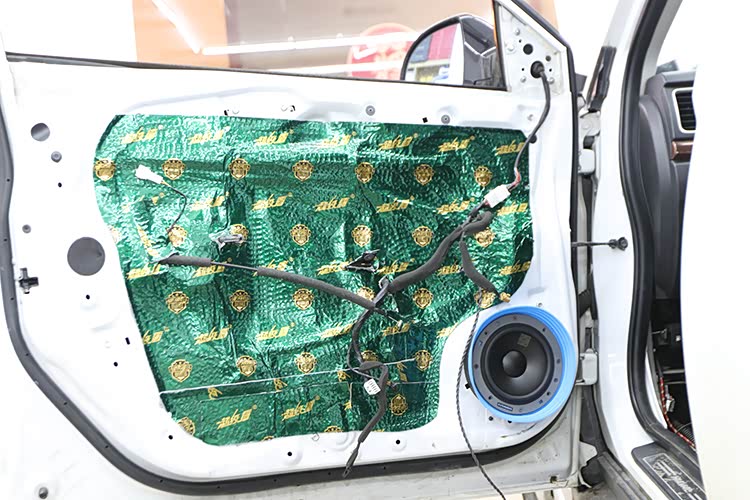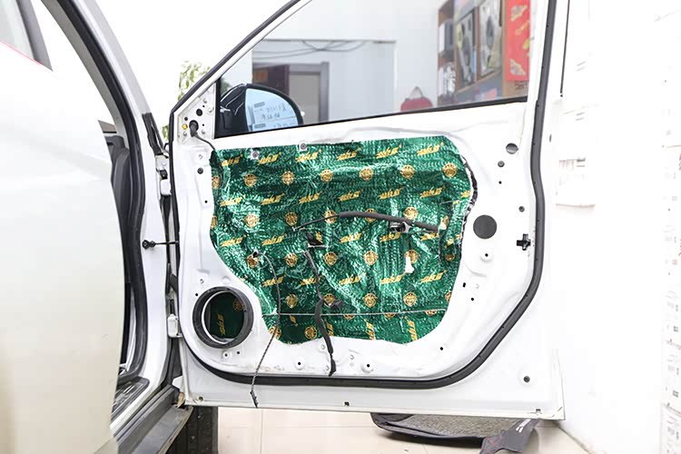 车门隔音,原车门板内部空洞结构较多,且未作任何有效隔音处理,改装师傅使用大能隔音材料,对哈弗H6门板做了双层隔音处理,让门板形成一个密封箱体,既可以有效减少风噪传入,同时也可以给声场喇叭创造一个良好工作环境。