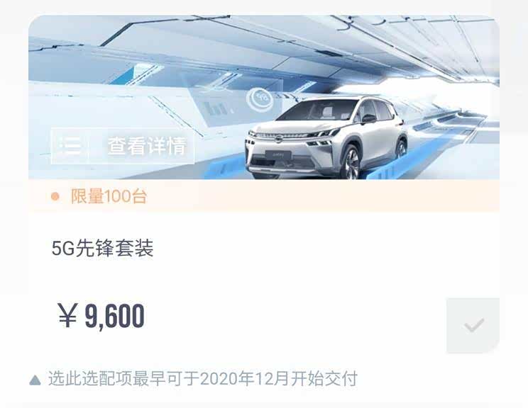 目前,5G版本需在广汽埃安App上进行选装,选装包价格为9600元,且仅限量100台。