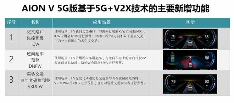 广汽埃安方面表示,5G版AION V提供3个“技能”,分别是交叉路口碰撞预警ICW、逆向超车预警DNPW、弱势交通参与者碰撞预警VRUCW。