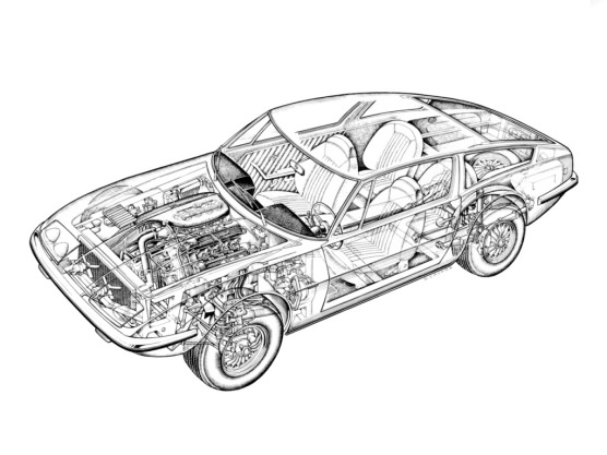 但应该说,笔者起了这么一个标题确实有点儿“哗众取宠”了,因为在整个合作的五年间,雪铁龙对于玛莎拉蒂算不上统治,而是一种互通有无的关系,雪铁龙没有像样的大排量引擎,所以玛莎拉蒂拿出自家的Tipo C114引擎放到了雪铁龙的SM引擎舱里,而玛莎拉蒂缺失的是悬挂技术,雪铁龙拿来了Hydropneumatic悬挂技术让玛莎拉蒂的工程师有了学习的机会。1968年3月的日内瓦车展上,两家公司合作后的第一款新车发布,这就是Indy,车架代号AM116。此车由Virginio Vairo和Elio Mainardi两位大师负责工程设计,采用双门四座位布局,引擎则采用4.2公升V8作后轮驱动,最大马力260匹;1971年引擎升级为4.7L,最大马力290匹;1972年追加了4.9升V8,最大马力320匹。但因为此车的底盘来自Ghibli,前悬挂为双摇臂、后悬挂为活轴+扭矩臂的非独立形式,所以在悬挂配置上未能见识到太多来自雪铁龙的设计元素。最后,Indy生产至1975年结束,一共生产了1104辆。