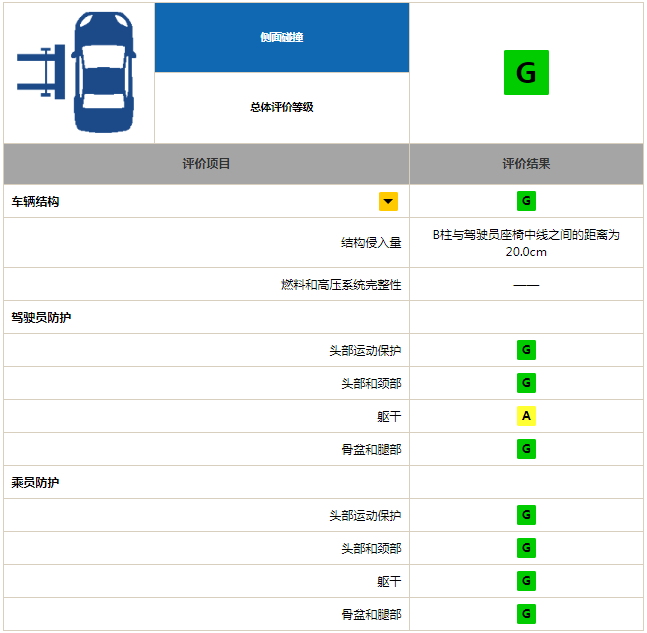 而在侧面碰撞中,领克03的也没有丝毫掉链子的迹象,按照以往的标准,B柱距离假人座椅中线12.5CM便是最低安全距离,而领克03在此次测试中得到了20CM的测试结果,表现也十分优秀。除了"躯干"这一项目很遗憾拿到了A之外,其余的项目均为G。