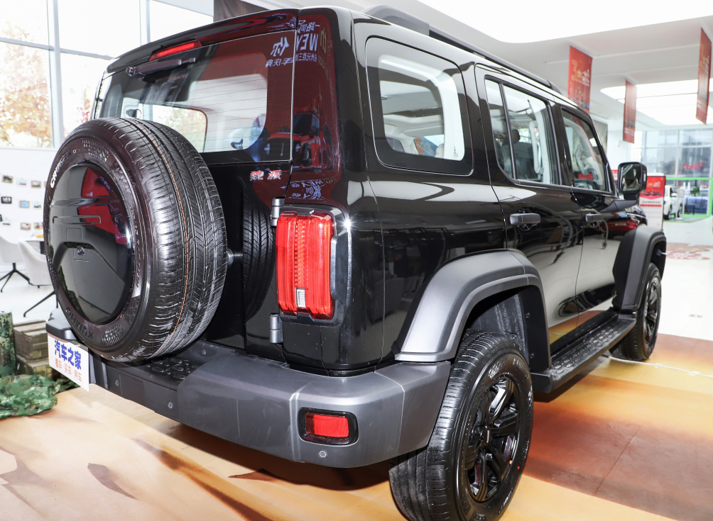 汽车尾部,首先映入眼帘的是外挂式的备胎将硬派SUV的越野气质显露无疑,纵向布局的后尾灯点亮起来有一点WEY的标识,牌照区域放在了左下角的位置。而且值得一提的是新车的后尾箱是采用了侧开的方式,基于坦克300是越野的定位,地台高一点也是可以理解的。