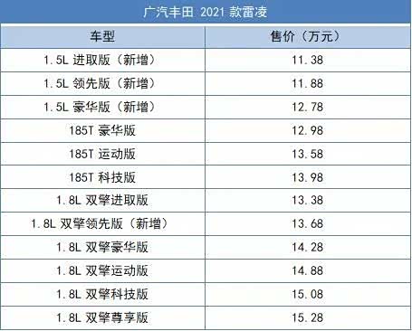 再来看雷凌,2021款雷凌一样推出12款车型,其中1.5L动力车型占3款,1.2T动力车型占3款,1.8L双擎车型占6款,售价区间为11.38-15.28万元。