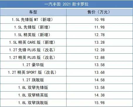 先来看卡罗拉,2021款卡罗拉共推出12款车型,其中1.5L动力车型占4款,1.2T动力车型占5款,1.8L双擎车型占3款,售价区间为10.98-15.98万元。