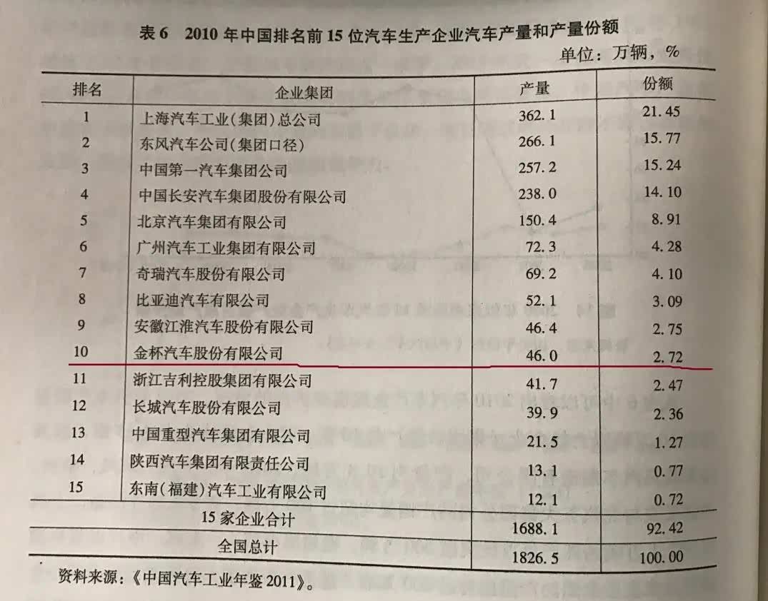 如果算汽车总量,根据《中国汽车工业年鉴2011》,金杯股份的总产量是46万辆,排名国内汽车厂家第十;在这个榜单上,吉利汽车以41.7万台排名11位,长城汽车39.9万台排名12位。