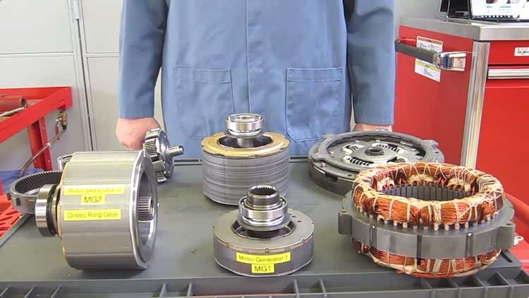 「E-CVT」顾名思义,其官方全称为「电子控制电磁离合式无级变速器」,所以「E-CVT」一般由2个调速「电机」,一组「行星齿轮」和「离合器」组成。当你看到「E-CVT」的拆解图后,是否有一种感觉『怎么看起来像带了电机的差速器』。不错,就是这样一个看似结构简单的变速器,却达到了CVT的效果。