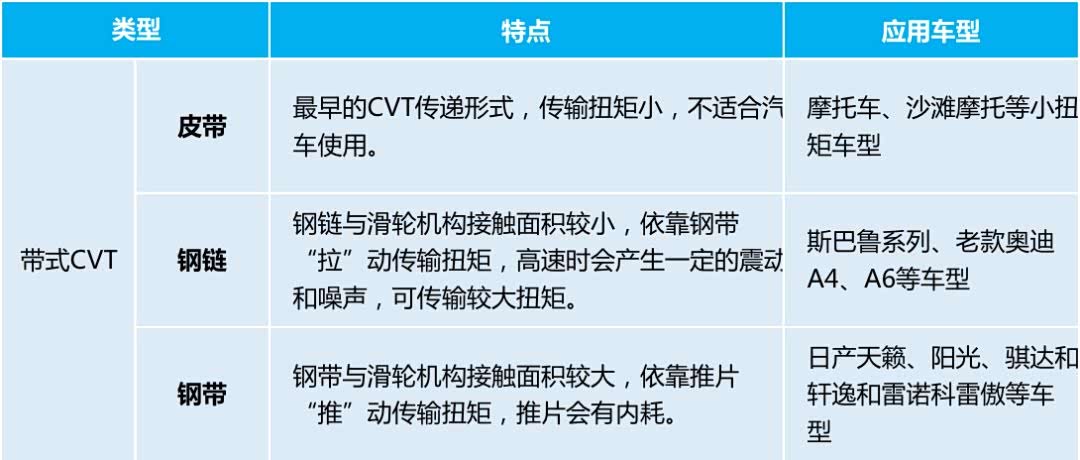 通过对三类「带式CVT」的简单讲解,相信大家已经有了一个初步概念,从传输扭矩大小的角度排序为「钢链」>「钢带」>「皮带」。