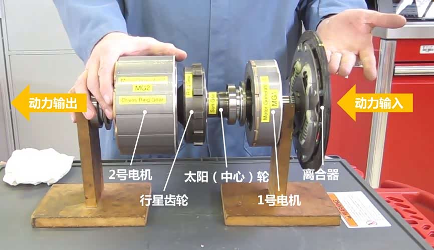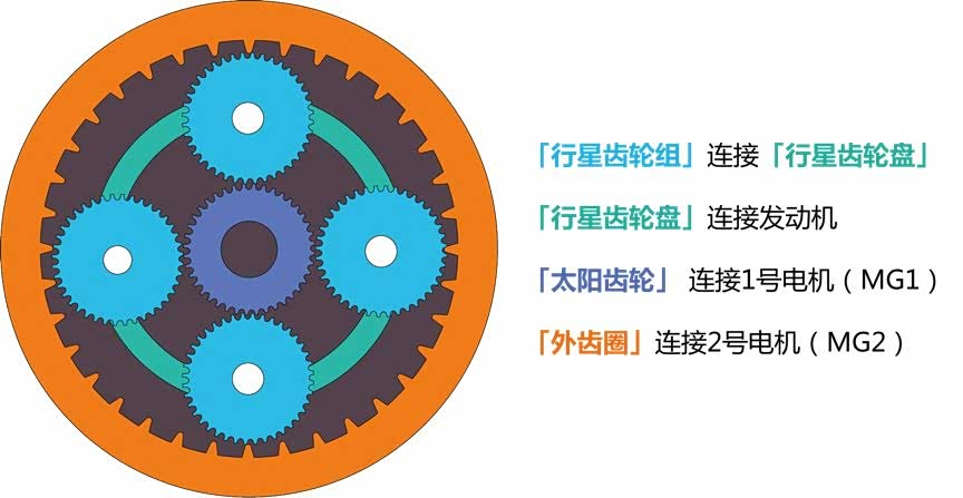 要搞懂「E-CVT」的工作原理,我们还是要将其变速的逻辑关系先理清楚,「E-CVT」的一个关键部件就是「行星齿轮组」,当我们研究「行星齿轮组」机构时,最重要就是要搞清『动力从哪来,到哪里去,整个流程是什么样』,所以,首先我们来看看「电机」、发动机、和「行星齿轮组」之间的联系。