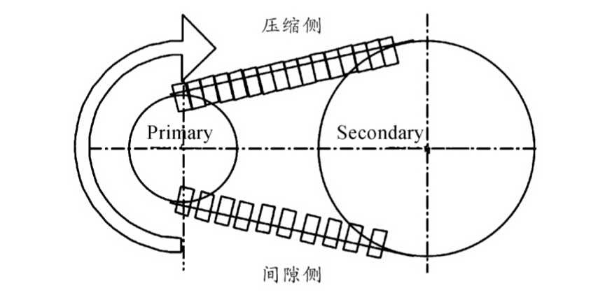 从上图中,我们发现「钢带」在运动时,在主从动带轮两侧的「推片组」,其中一侧受力,另一侧不受力,这样将使得「推片」之间的间隙存在于不受力的一侧「钢带」,而在不受力的「推片」继续运行进入带轮并过渡到「钢带」的另一侧时,「推片」之间的间隙将消失,这将导致推片和带轮之间产生相对滑动。