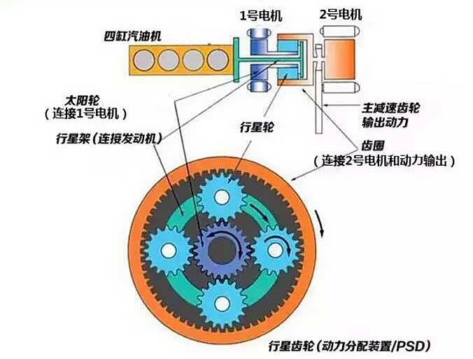 1、发动机的动力可以通过「行星齿轮盘」分配给车轮和1号电机;