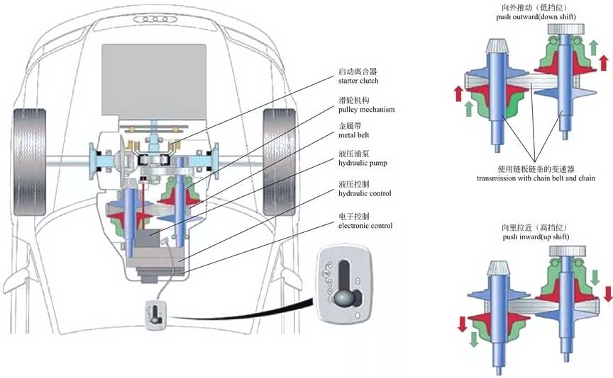「滑轮机构」的「锥形盘」成V形结构,「锥形盘」可在液压的推力作用下收紧或张开,挤压「传动带」以此来调节V形槽的宽度。当「锥形盘」向内侧移动收紧时,「传动带」在「锥形盘」的挤压下向圆心以外的方向(离心方向)运动,相反会向圆心以内运动。这样,「传动带」带动的圆盘直径增大,传动比也就发生了变化。