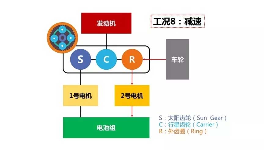 减速时,发动机关闭,「1号电机」空转。「2号电机」由车轮带动变成发电机吸收车轮的减速能量,同时为电池组充电。