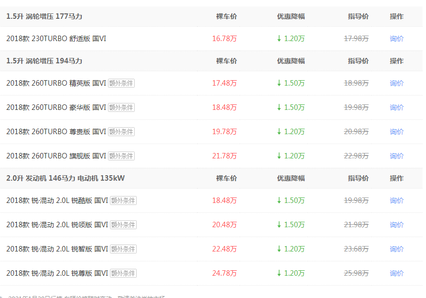 车家号·0浏览·2021-01-20 17:32 · 安徽近日,在广州地区某经销商处了解到,本田雅阁有较大的优惠力度,部分车型最高优惠可达1.5万元。其中2018款 260TURBO 精英版 国VI车型可优惠1.5万元,这使得该车型的裸车售价低至17.48万元。具体车型优惠如下图所示