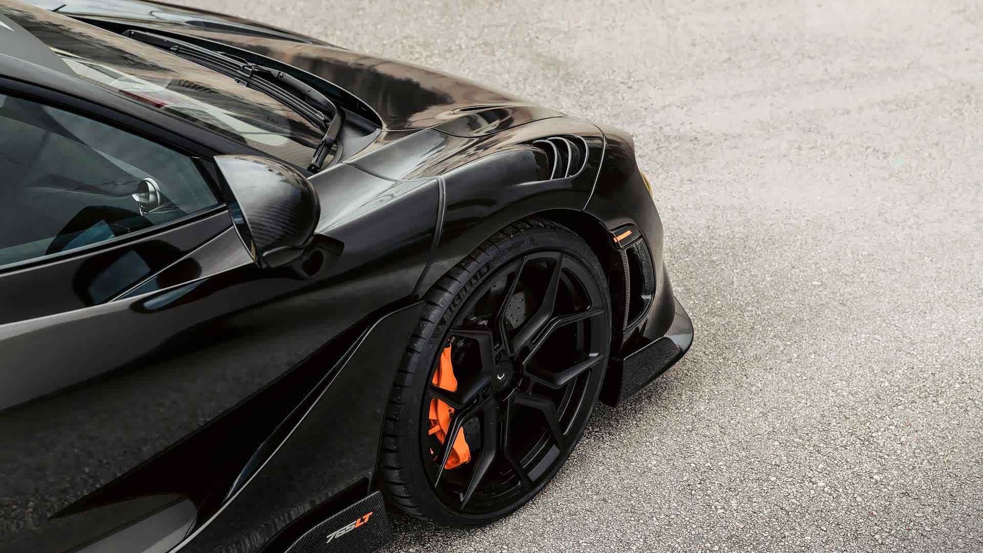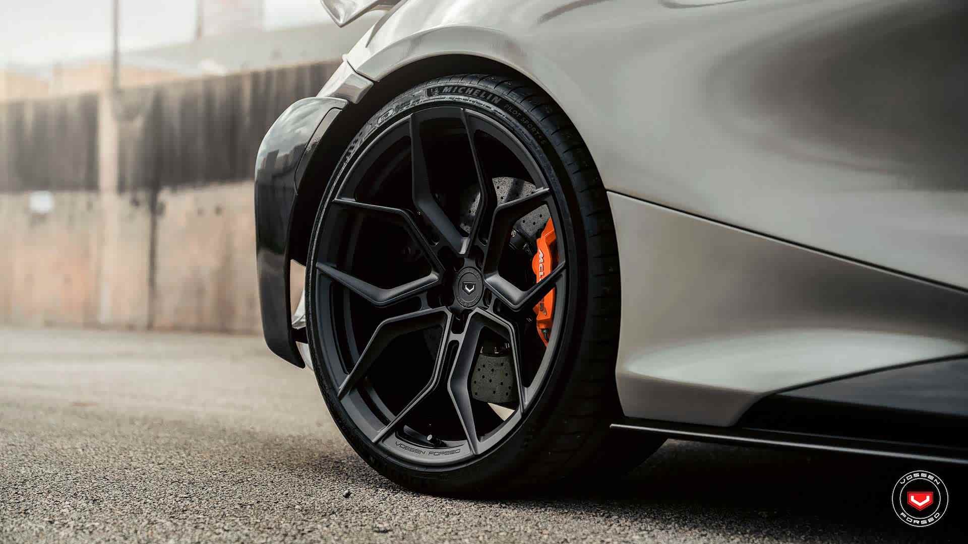 这台迈凯伦765LT全球限量生产765台,从外观上来看就炫酷无比,车头采用的黑色车漆慢慢的渐变到车尾变成Nardo灰,前轮尺寸20英寸,后轮尺寸21英寸,是Vossen Evo-3锻造轮圈哦,而且有48种颜色可选择,规格从19到24英寸,每个轮毂价格1800美元起。