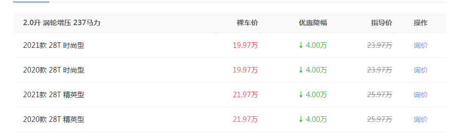 车家号·0浏览·2021-01-26 19:21 · 安徽近日,在上海地区某经销商处了解到,凯迪拉克CT4有较大的优惠力度,部分车型最高优惠可达4万元。其中2021款 28T 时尚型车型可优惠4万元,这使得该车型的裸车售价低至19.97万元。具体车型优惠如下图所示