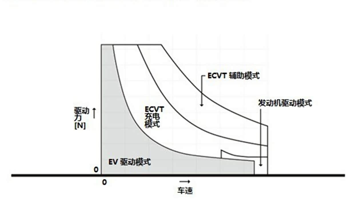在车辆需要急加速或较大驱动力时,发动机带动发电机工作,同时蓄电池放电,所有电能用于驱动电机,即上图ECVT辅助模式;