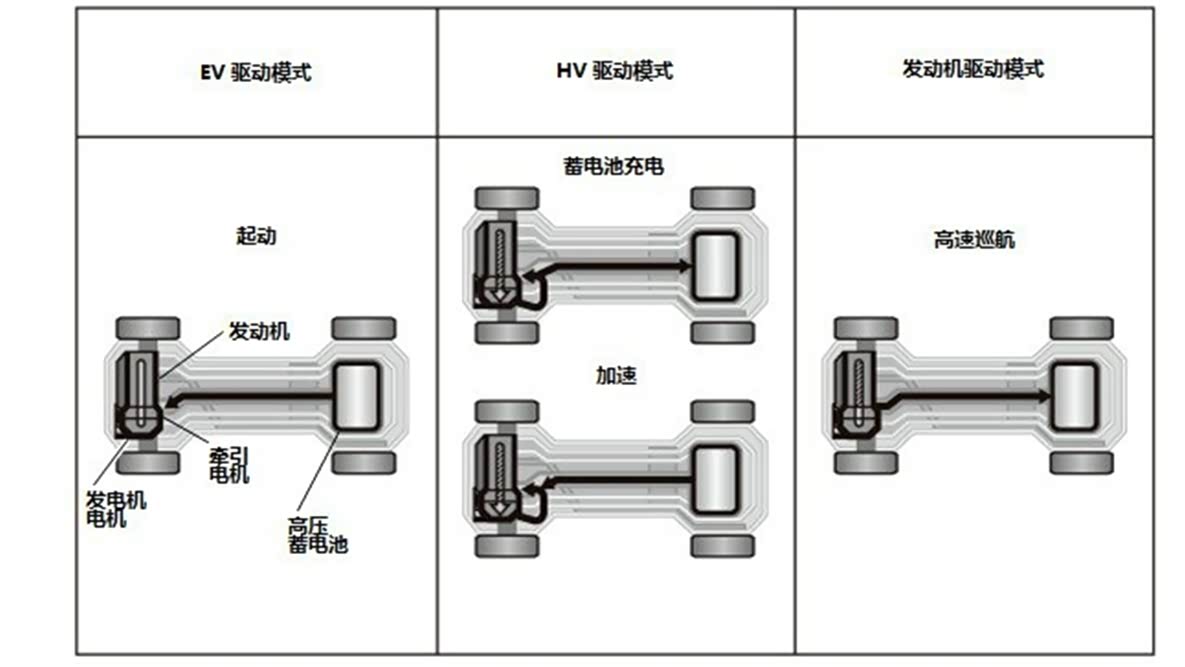 车辆起步时蓄电池给驱动电机供电,驱动电机带动车辆,此时发动机不工作,即上图EV驱动模式;