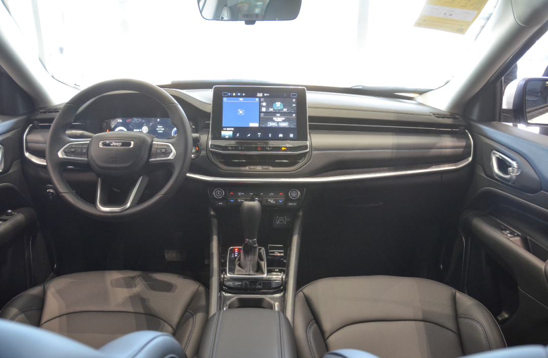 新车采用了全新设计的横向贯穿式中控设计,简洁分明。实拍车型Jeep新指南者 220T精英版采用了全黑配色,更具运动感。