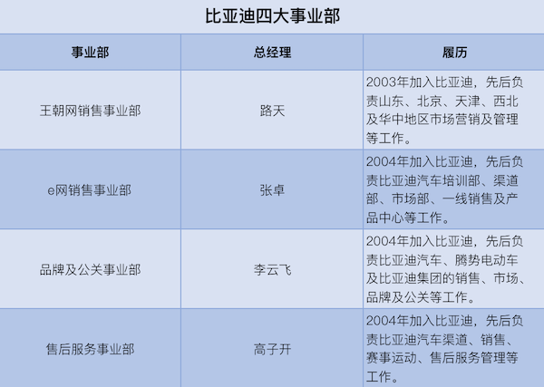 在此之后,比亚迪更有祭出大手笔的机构改革,成立了4大事业部,打破了原来的垂直体系,改为扁平化管理,资深元老纷纷从幕后走到台前。从简历可以看出,4大事业部总经理都在比亚迪工作了十七八年,对比亚迪品牌有着根深蒂固的认可,可以说是比亚迪创立以来的根基。他们对比亚迪的产品体系非常熟悉,都有销售和售后经验,执行力非常强。这种设置也符合比亚迪现在的分网销售模式,可以让品牌总经理更好地因地制宜调配资源和任务。