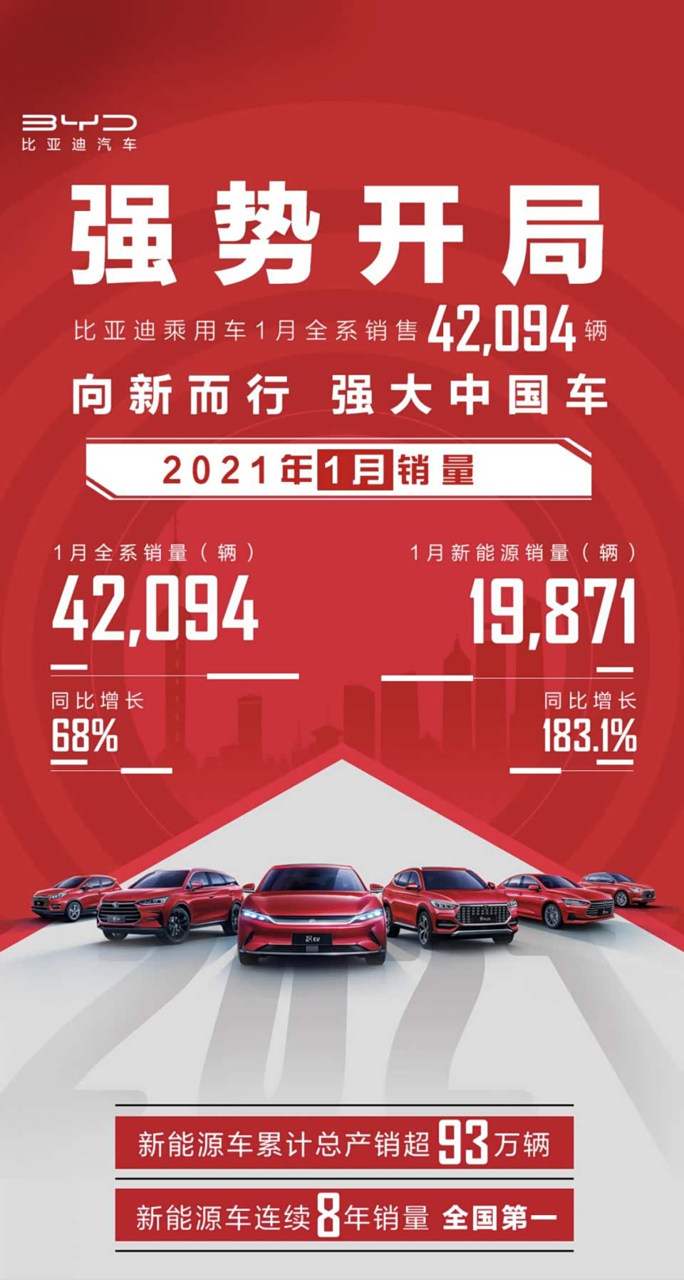 比亚迪全系在1月销量为42094辆,同比增长68%。其中,比亚迪新能源汽车销量19871辆,同比增长183.1%。