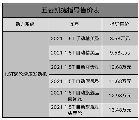 五菱凯捷共有6款在售车型,一种动力总成,指导售价为8.58-13.48万元不等,其中包括了一款手动挡车型,五款自动挡车型。