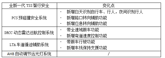 PCS预碰撞安全系统新增在白天识别自行车、行人,夜间识别行人功能,通过毫米波雷达传感器和单目摄像头检测,并通过警报器和多功能信息显示屏告知碰撞的可能性,踏下制动踏板时启动预碰撞制动辅助,如果没有踏下制动踏板,将自动启动预碰撞制动,有效防止碰撞或减轻伤害;新增路口转向辅助功能,十字路口左转时,对向有直行车辆,或者自身车辆左/右转向时,人行横道有行人穿越,也能进行识别,并且通过警报器以及多功能信息显示屏告知碰撞的可能性,启动预碰撞制动器,辅助避开操作和减轻伤害;新增应急转向辅助功能,当驾驶者进行方向盘避开操作时,可进行方向盘操控以及车线偏离控制辅助操作。
