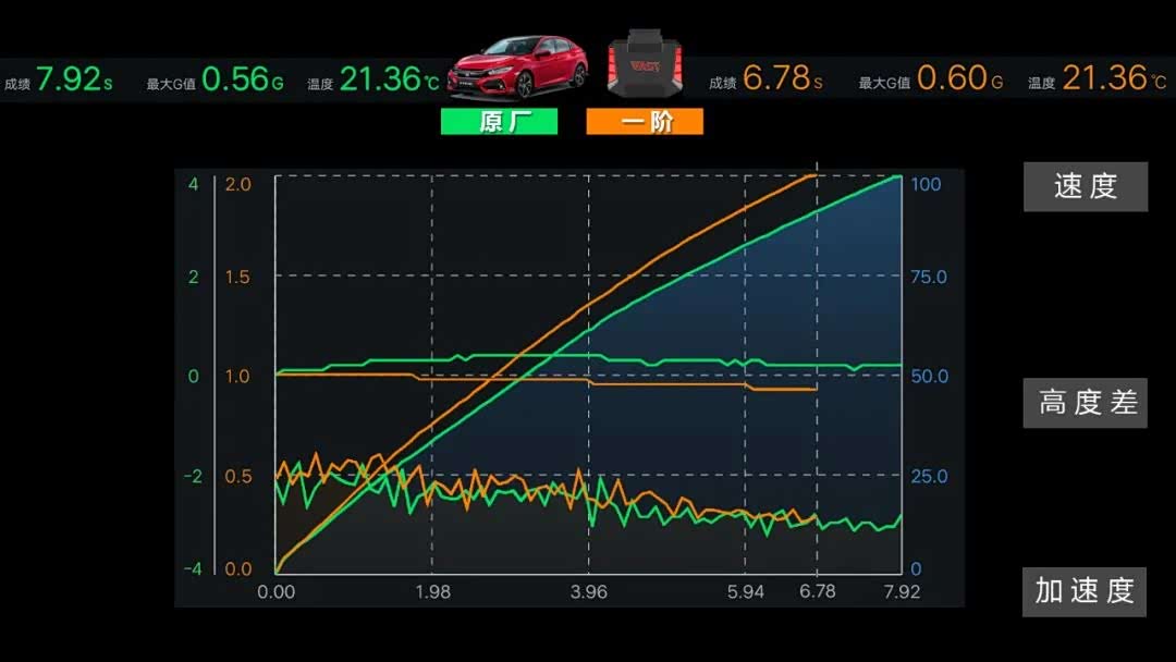 改装一阶段之后,我们测试的最佳成绩6.78S,相对于我们之前做的国五的思域而言,加速成绩慢了0.3S左右,这也许就是厂家为了排放做的一些妥协。