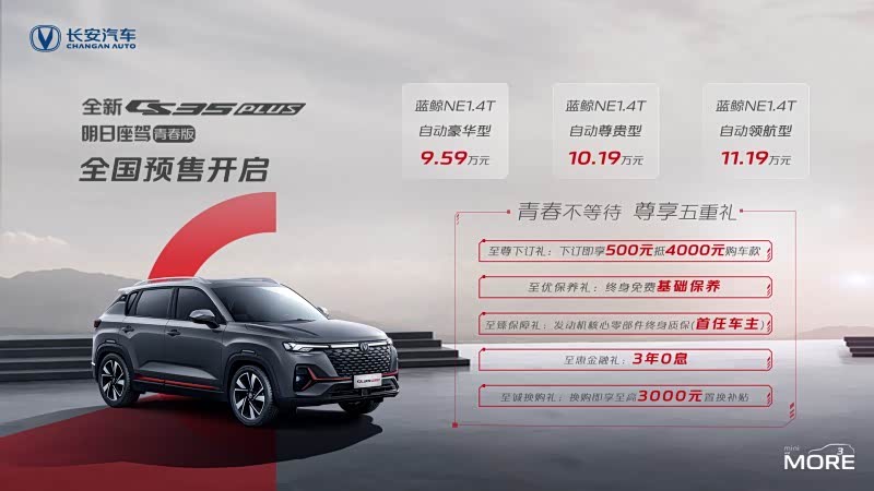 长安汽车全新CS35PLUS即将推出3个配置车型。其中,蓝鲸NE1.4T自动豪华型9.59万元;蓝鲸NE1.4T自动尊贵型10.19万元;蓝鲸NE1.4T自动领航型11.19万元。