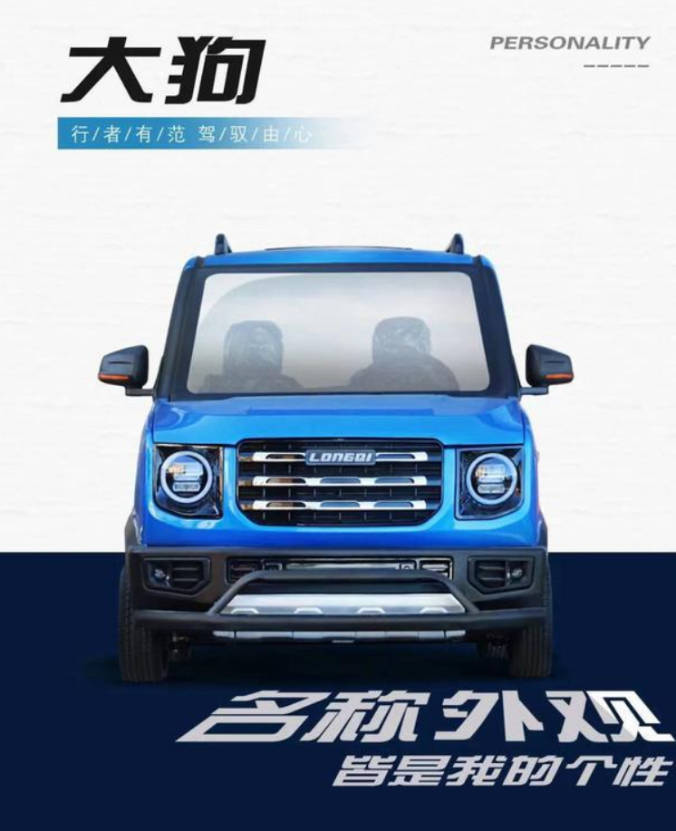 这款车名字是龙启大狗,来自于山东的电动四轮车制造企业,本质而言这款车就是很典型的国产老年代步车。看看这家代步车厂商以前的产品就会发现,早已经习惯了抄袭之路,因为此前超过宝马mini和路虎卫士,基本上海外豪华品牌只要推出新产品,这家龙启电动车厂就会迅速跟进,压根不需要拿皮尺去量,仅仅依靠海外品牌发布的官方渲染图就能够自己开发模具。
