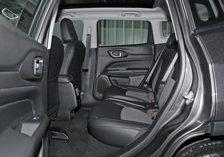 指南者的轴距为2636mm,而紧凑型SUV的标准轴距约为2680-2710mm之间,我身高1.8米,坐进后排腿部空间一般,膝盖距离前排靠背约1拳左右,好在左右座椅设计得比较厚实柔软,还是有比较不错的乘坐体验,中间的座位就聊胜于无,只能适合短途乘坐,头部空间就很局促了,我坐直身体之后已经不足1指的距离,所以不太适合高体型的人士乘坐。前排空间也表现一般,座椅放倒最低,距离头部不足一拳,所以整体还是有些偏小。